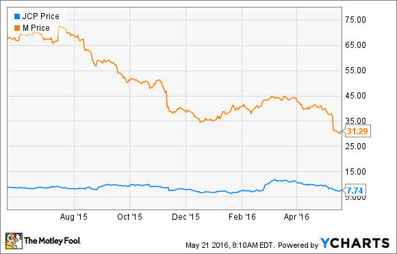 Macy's shares have been on a downward trend while J.C. Penney has perked up a little over its 12-month lows. Image source: YCharts.com.