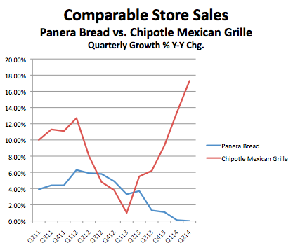 It perhaps also explains why other fast-casual chains like Chipotle Mexican Grill (CMG +0.29%) continue to do well while Panera lags. While storewide sales at the bread maker have gone flat after a long downward spiral, the healthier burritos and taco maker are seeing comps soar.