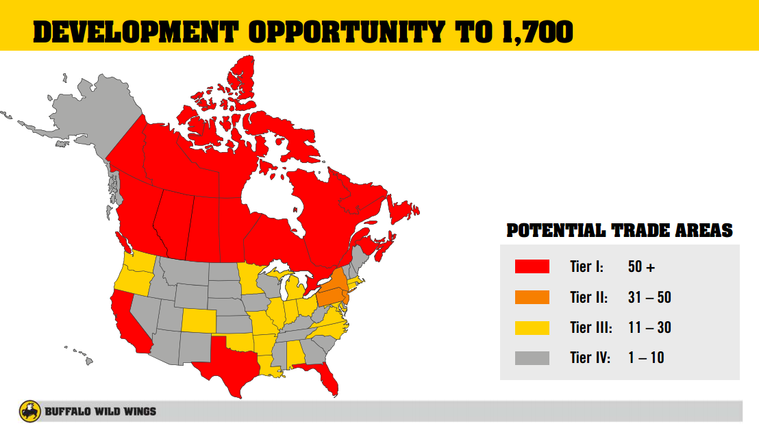 To be sure, plenty of attention will be paid to Canada, where Buffalo Wild Wings only opened its first location in mid-2010. But even then, there's no shortage of Tier I, II, and III trade areas in the U.S., and many of the Tier IV opportunities already have B-Dubs locations serving a significant chunk of the population.