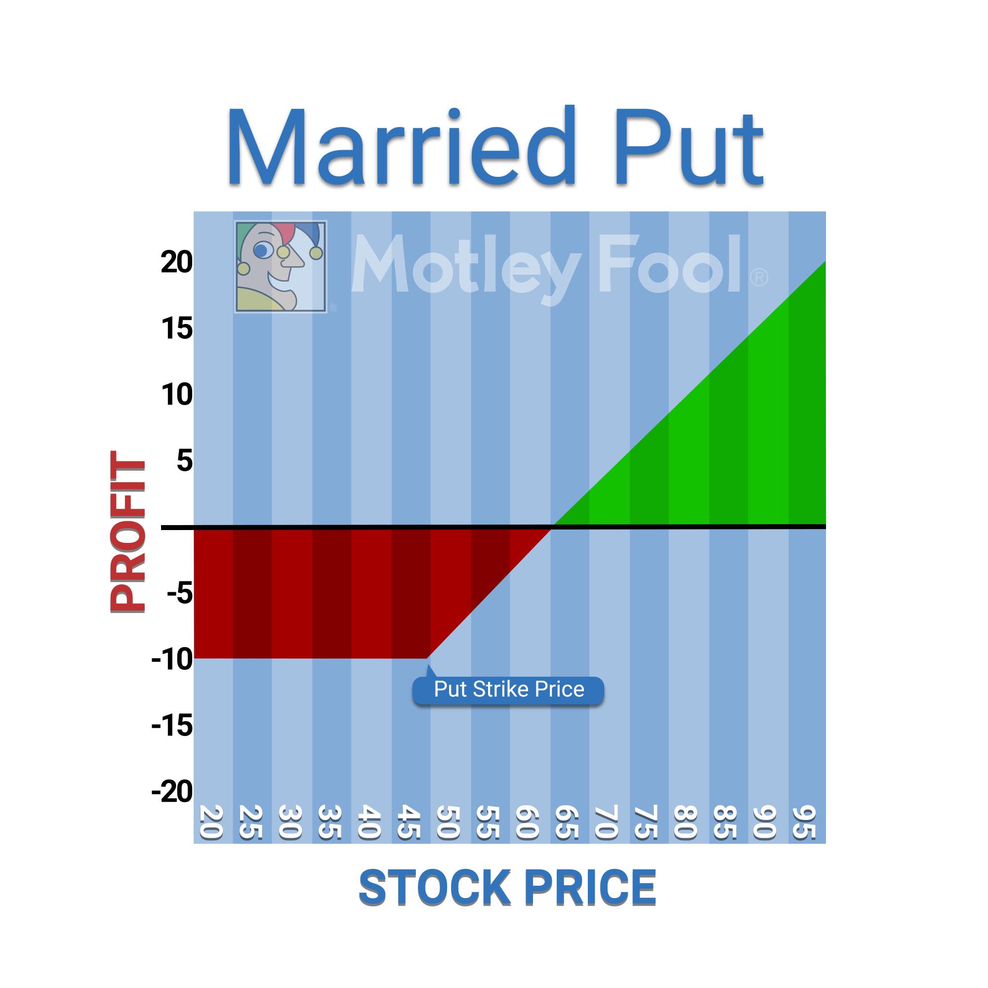 A married put is a strategy where a long investor purchases a put option that typically will have a strike price lower than the current stock price. By owning the put as well as the stock, the investor is protected from any downside below the put's strike price, since the investor can exercise the put and sell the underlying. Simply put (no pun intended), buying a protective put is similar to buying insurance against a stock's decline.