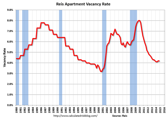 Apartment REITs, however, are very different. The average apartment lease typically falls between 12 and 24 months, exposing these REITs to greater fluctuations in rental revenue. In good years, apartments can raise prices each time a lease is renewed every year or two. However, in down cycles prices locked in at the top will reset quickly at the bottom. Apartments have been good investments over history, but they aren't immune to cycles. As you can see in the chart above from the blog Calculated Risk, vacancy rates swing dramatically with the economy, and because apartments have short-term leases, apartment buildings have greater income volatility.