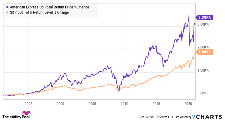 American Express makes this list of best dividend-paying bank stocks because it has a long track record of delivering robust returns, in part because its dividend is both generous and reliable. The returns delivered by American Express over the past three decades have dwarfed those of the broader market, as the chart below demonstrates: