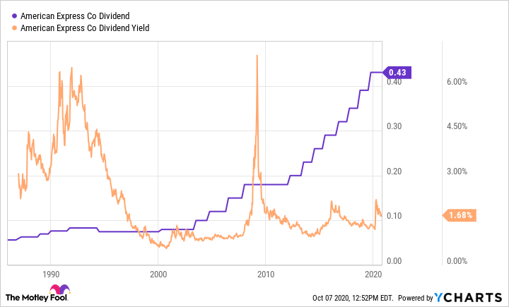 Perhaps surprisingly, American Express' dividend yield (equal to the dividend paid divided by the stock price) during much of its history has been less than 2%. But the consistent and massive rise in the value of its stock has meant that the absolute value of its dividend has steadily increased and likely will continue to increase in the years ahead.