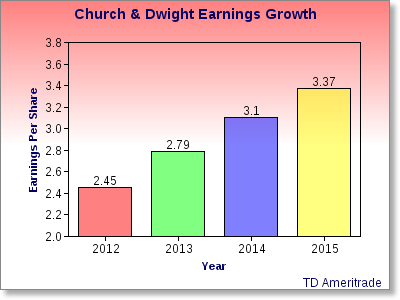On August 1, 2013, Church & Dwight declared its 450th consecutive quarterly dividend. This dates its streak of payments back to 1901, surviving the Great Depression, the Great Recession, and every other hectic time in the market. Making it through the toughest of times allows investors to remain confident that this dividend income will always be there; not to mention that the payments have been raised for the last 17 consecutive years. The company currently pays out $1.12 annually, representing a yield of roughly 1.97%. Earnings growth, dividends, and dividend growth make Church & Dwight a triple threat.