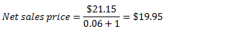 Let's say that you bought a DVD, and your credit card statement shows that you paid $21.15. You know that your state's sales tax rate is 6% and that there are no other taxes on merchandise. Using the formula discussed earlier, we can calculate the net sales price as follows: