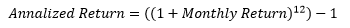 Note that most of the time, monthly returns will be relatively small. That's because most people are used to seeing annual returns rather than monthly ones. If you want to know the corresponding annual return, then there are two things you can do. The simple, but less accurate, way is to multiply the monthly return by 12. The technically correct way is to add 1 to the monthly return, raise the result to the 12th power, and then subtract 1 back out. This will result in a slightly larger number than the simple method.