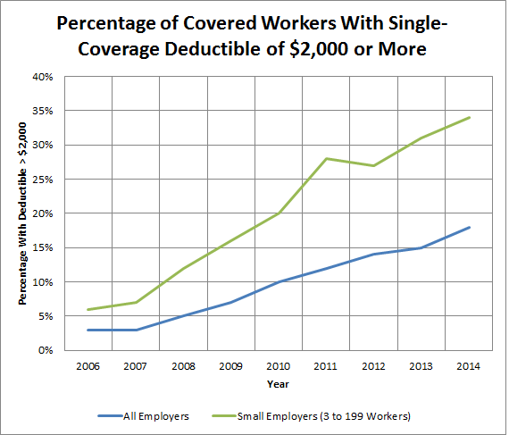 If paying more got workers better coverage, then you could at least argue that taking on more of the costs was a fair trade. But the amount of money workers have to pay upfront before insurance benefits even start kicking in at all has risen at an alarming clip. In 2006, just 3% of workers who were covered by a health plan at work had to pay deductibles of $2,000 or more for single coverage. By 2014, that number had risen to 18%.