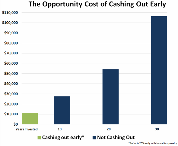 Think about it this way. If you cash out at 40 years old, you aren't just taking out $14,000 -- you're taking away decades of potential compound growth: