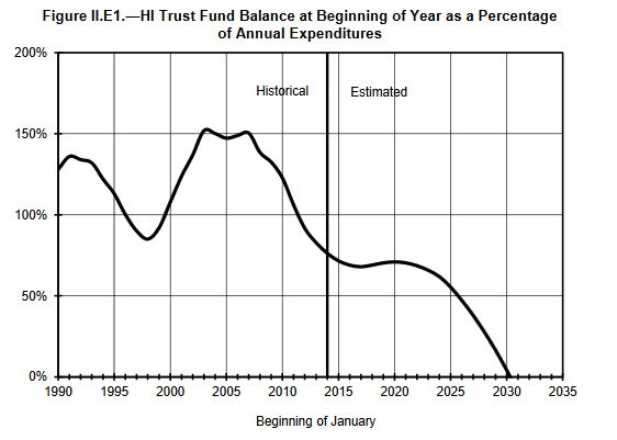 Simply put, the hospital insurance program is projected to start running a deficit in a few years, and the trust fund is expected to run out of money completely in 2030. Once this happens, the only money available to finance benefits will be incoming payroll taxes, which are expected to cover just 86% of the program's costs.