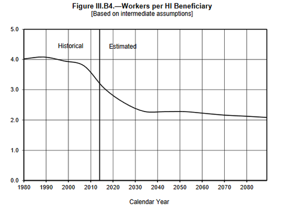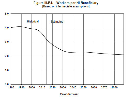 In other words, the number of workers paying Medicare taxes for each beneficiary is being cut almost in half.
