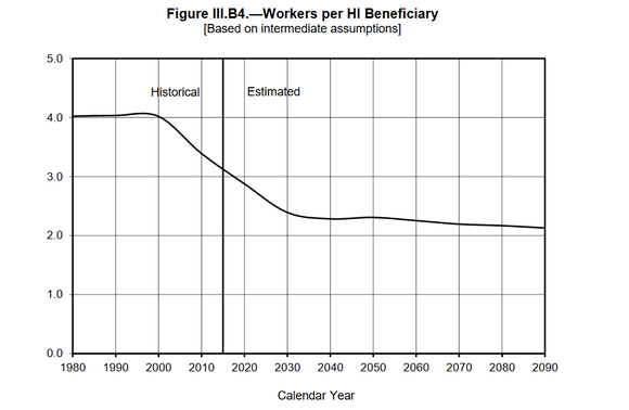 In a nutshell, there are fewer people paying into the system than in previous years, and this is expected to become an even bigger problem over time. Historically, about four workers were paying into Medicare for every hospital insurance beneficiary. As of 2015, this figure had dropped to 3.1 workers per beneficiary.