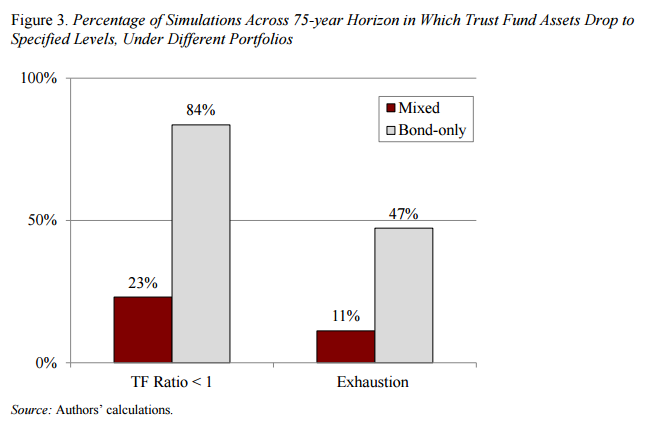 In fact, by the Social Security trustees' metric of short-term financial adequacy -- a ratio of 1.0, which means that the trust fund has enough money to cover outlays for the year -- the mixed portfolio has a much better record in simulations than the bond-only portfolio.