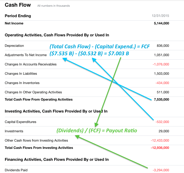 AbbVie (ABBV +0.66%) is the perfect example of such a stock. It currently yields 3.6%, and has grown its dividend by 13% per year since being spun out of Abbott Labs in 2012. Here's an easy visual for how to figure its payout ratio from FCF, using 2015 FCF numbers on Yahoo! Finance.