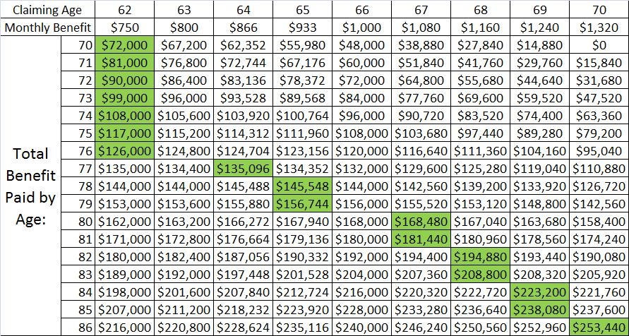 For most people, this means, on average, that you'll collect about the same total amount of money. Still, there are circumstances where you may be able to hedge your bets and increase your odds of receiving more total money by filing at a specific age. Here's a table that shows (in green) where your filing age and age of death would correspond to the most total dollars paid: