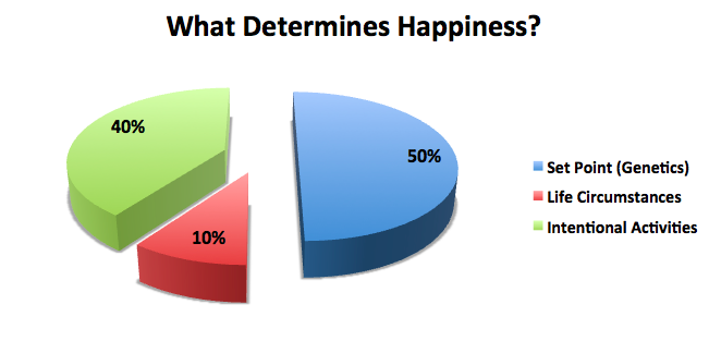 The data points to some pretty surprising conclusions, the most striking being "The 40 Percent Conclusion." In effect, this states that 50% of our own levels of happiness, contentment, and general well-being are determined by genetics. That's not that surprising, given what we know about heredity. But it's how the other half of the pie -- what we actually have some control over -- that was shocking.