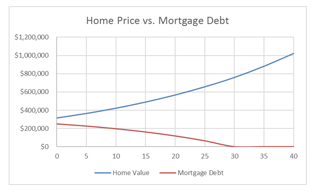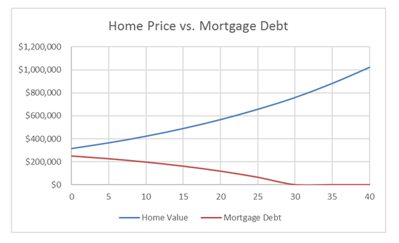 Perhaps the best argument to be made for buying a home and living in it for decades is this chart of home value versus mortgage debt over a 40-year period: