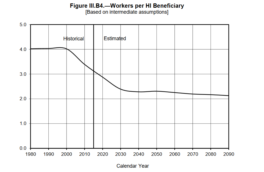 It's what's expected after 2020 that's concerning. After that time, the program is expected to run deficits for the foreseeable future. With the ongoing retirement of the baby boomer generation, there are simply going to be too many people drawing benefits from Medicare and not enough workers paying in. Historically, there have been about four workers paying into Medicare for every beneficiary. Today, that ratio is just over 3-to-1. By 2030, the workers-to-beneficiaries ratio will be closer to two.