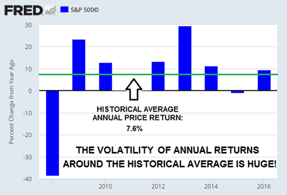 The following graph illustrates the huge dispersion of annual (price) returns around the long-term average annualized return 7.6% (green line), beginning in 2008:
