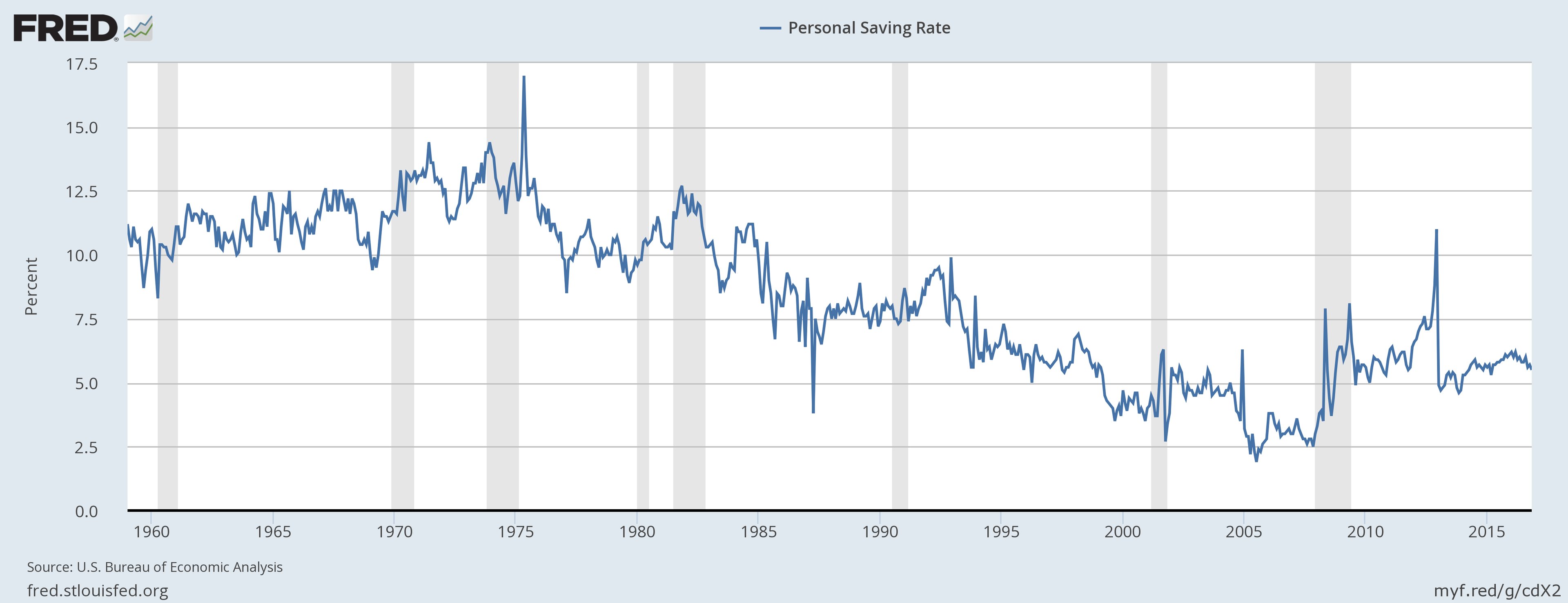 As you can see from the chart, increases in the personal saving rate only seems to occur when there's a recession and a motivation to save. Over the past 50 years, the personal saving rate has been more than halved to 5.5% as of Nov. 2016 from 11.7% in Nov. 1966. Comparatively, citizens in most developed countries sock away around 10% of their income, which falls right into the wheelhouse of what most financial advisors in the U.S. would suggest (saving 10% to 15% of your income).