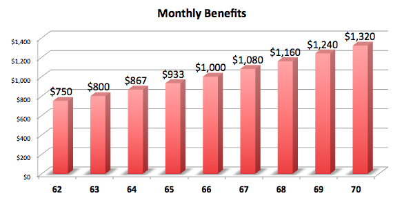 To illustrate how the breakdown of benefits goes, let's assume a retiree has a benefit at full retirement age of $1,000 per month. Here's how those benefits could change, based on when they are claimed.