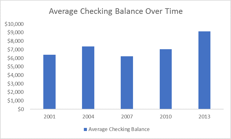As you can see, checking account balances climbed between 2001 and 2004, dropped a bit in 2007, and then slowly but surely crept back up for a 12-year high by 2013.