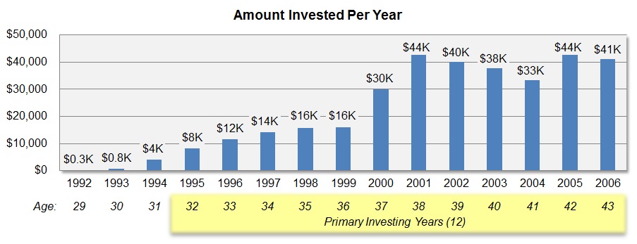 The first three years of this 15-year period were insignificant in terms of investing because we were focused on buying and furnishing our home, paying off loans, and switching to a 15-year mortgage. During our 12 primary investing years, we averaged just more than $28,000 per year, or $2,333 per month, in investments.