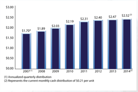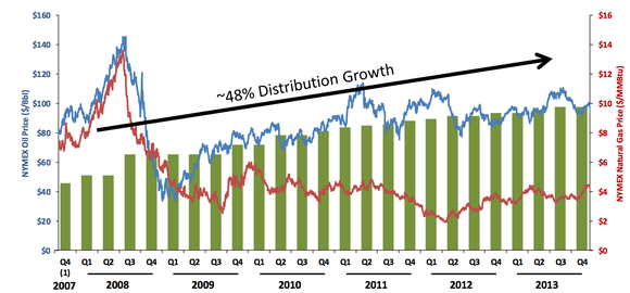 As this chart shows, Vanguard Natural Resources has increased its total payout by 48% since 2008. Unfortunately, Vanguard Natural Resources has also increased its unit count over the same period, so individual unitholders haven't seen such a large increase. But the company's unitholders have still seen their distributions increase by 33.3% over the same time period.