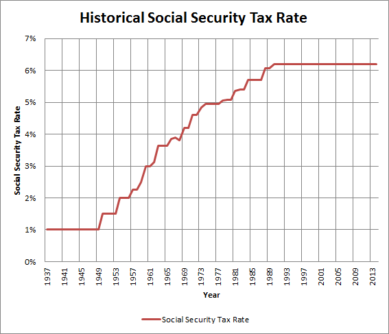 Beyond the progressive nature of Social Security, the other big variable that has changed over the years is the amount people pay in Social Security taxes. When the program first started, the payroll tax rate was a meager 1%, and it only applied to the first $3,000 of income someone earned. Over time, payroll taxes climbed, but it was only in the 1990s that they reached their current rate of 6.2% for the employee contribution toward Social Security.