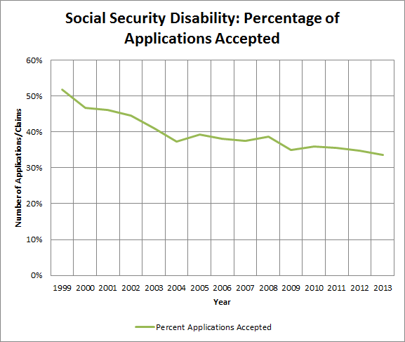 Yet even with that surge in applications, the percentage of those claims gaining approval has plunged. The SSA accepted more than half of all applications for disability in 1999, but that rate fell to 33.5% by last year.