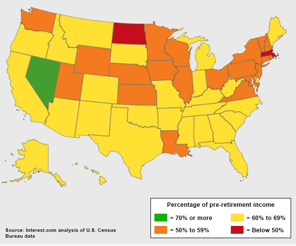 Green indicates more than 60% income replacement. Yellow indicates replacement between 50% and 60%. Red indicates less than 50% replacement. Source: U.S. Census, Interest.com, and diymaps.com.
