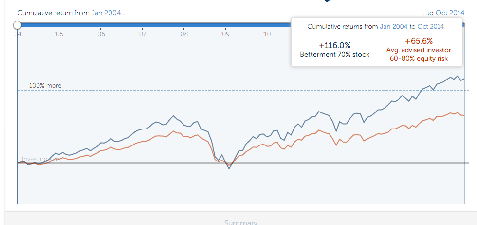 Over the past 10 years, a Betterment portfolio with a 70-30 split between stocks and bonds would have yielded a 116% return, while the average advised investor saw a gain of 65.6%.