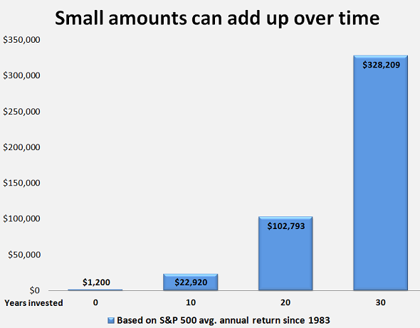 Even a lower rate of return -- say, 8% annualized (about 50% lower than the actual average since 1983) would turn $100 per month into $159,000. Long-term investing is a great way to build a safety net.