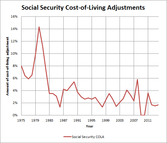Part of the reason retirees feel strongly about these cost-of-living adjustments is that increases in recent years have been especially stingy. As you can see below, COLAs were unusually small from 2009 to 2014; there were two years of flat benefits and just one year in which benefits rose by more than 2%. That's well below the 3.2% average increase in benefits over the 10 years prior to 2009.