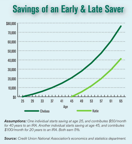 I'll never forget when my dad showed me a chart illustrating the power of time in saving for retirement. I was 16 at the time, and the chart looked something like this: