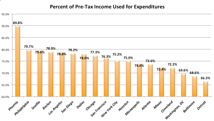 Here's how it plays out, while leaving the order of the cities presented -- from lowest to highest expenditures -- exactly the same as above.