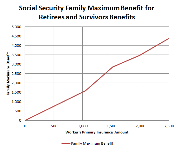 The family maximum benefit puts a limit on Social Security's total payouts in those circumstances. The formula is unnecessarily complicated, with bend points that make the exact amount dependent on your specific primary insurance amount. However, for retirees, the following graph will give you an idea of what the maximum is for the family of a worker who turns 62 in 2015 or dies this year prior to reaching age 62: