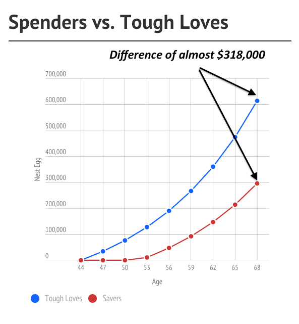 Let's say the Spenders and the Tough Loves all retire at age 68. Assuming an inflation-adjusted return of 6.9% (the historical average for the stock market since 1871) on investments, look at how much money each couple puts away from age 45 to age 68.