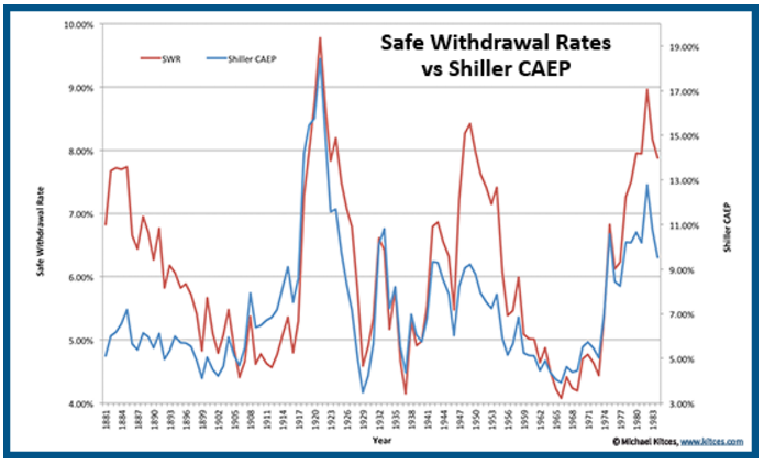 "If we look at the earnings yield of stocks using Shiller methodology and compare it to the 30-year SWR, the correlation is a remarkable 0.77," states Kitces. "Market valuation and earnings yields at the start of retirement are remarkably predictive of 30-year safe withdrawal rates!"