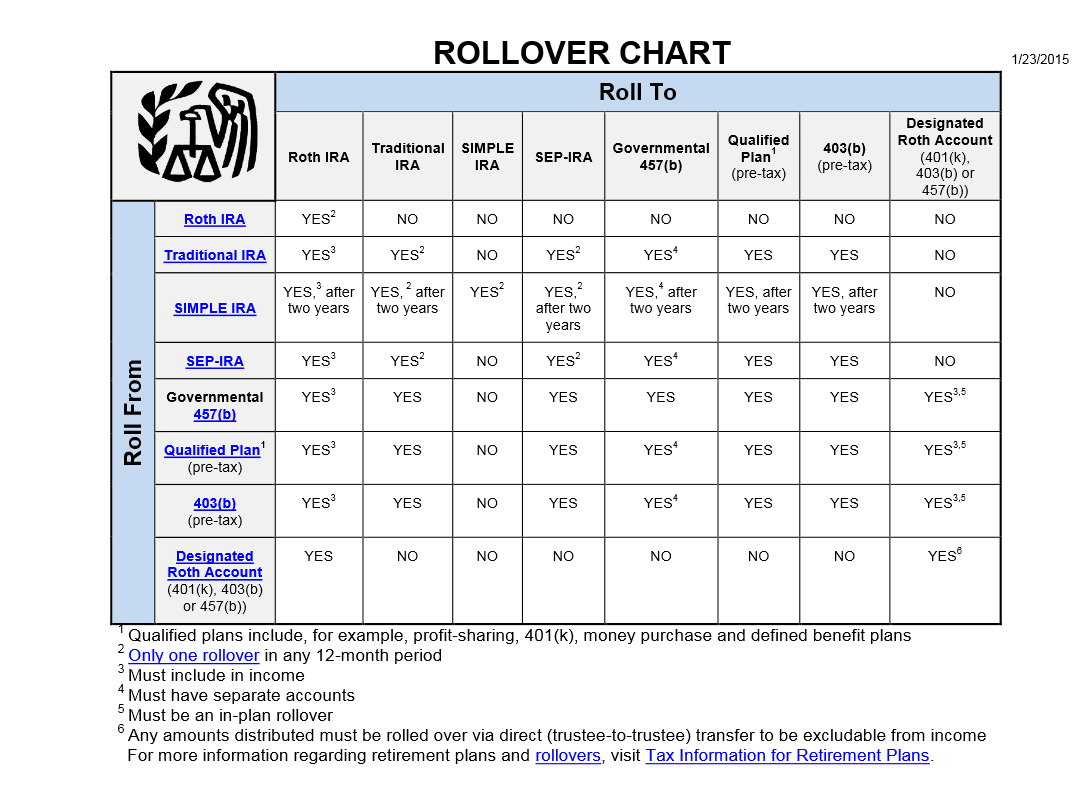 A new rule regarding IRA rollovers went into effect in January limiting IRA rollovers to one per year between accounts of the same type. In other words, if you want to combine two traditional IRA accounts by rolling one into another, you won't be allowed to roll over another traditional IRA for another year. Here's a table from the IRS that clarifies the rollover rules.