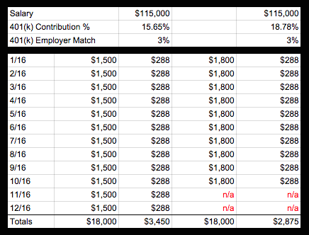 Here's a look at the contributions over the course of the year at two different rates. In both situations, the employee personally contributes $18,000, but at a deferral percentage of 18.78%, they cost themselves more than $500 in employer matching.