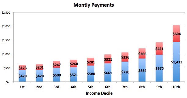 Once you have that figured out, you can see how your own rent or mortgage payment -- again, inclusive of taxes, insurance and utilities -- compares with the average for your particular decile. For further clarification, the blue section represents mortgage (including property taxes) or rent, while the red section represents utilities and insurance.