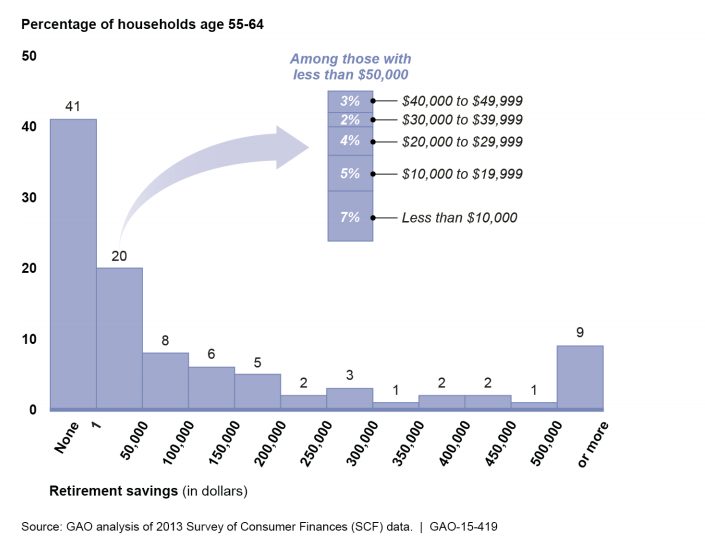 This means the median household approaching retirement has a nest egg of between $10,000 and $20,000. This number is drawn down significantly because 41% of these households have no retirement savings whatsoever.