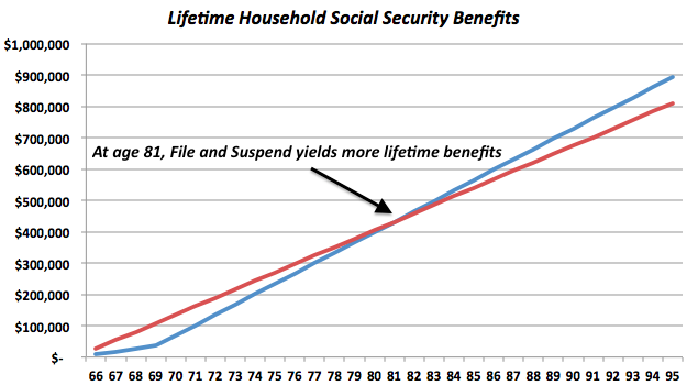 Rosie and Rob get to have their cake and eat it too: both will be able to maximize their Social Security benefits. To get an idea for how this plays out, look at the chart below. The blue line represents Rosie and Rob using File-and-Suspend, while the red line shows what happens if they both start collecting at age 66.
