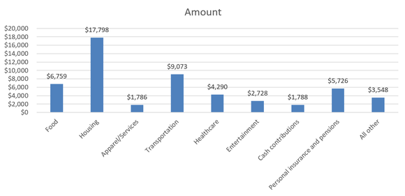 According to the Bureau of Labor Statistics, the average American household's pre-tax income was $66,877 and expenditures were $53,495 in 2014, the latest year for which data is available. Breaking it down into categories, here's how the average American spends their money: