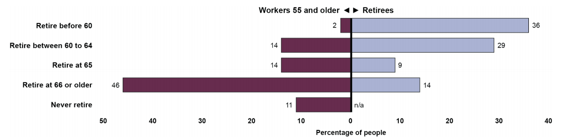 While there's one flaw with this data -- those who have yet to retire and are well above 66 still fall in the group on the left -- the data represents a key disconnect between our plans for retirement, and the reality of retirement.