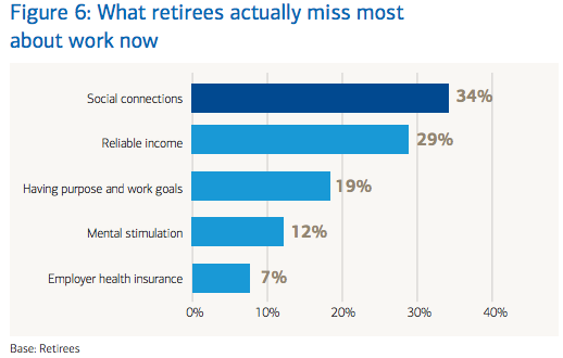 If you step back and think about it, this should come as no surprise. We humans are social creatures, and it is through social connections that we find meaning in our life. Between them, social connections and "having purpose" account for what over half of retirees say they miss most.