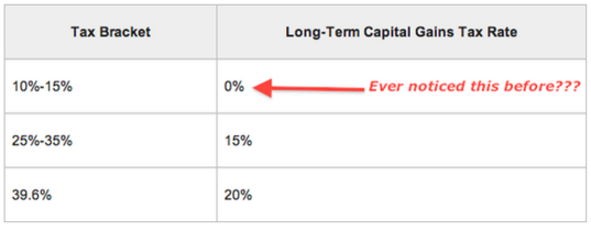 If your household falls under the 10% or 15% tax bracket, then you can sell your investments -- up until they bump you into a new tax bracket -- and pay absolutely no taxes whatsoever!