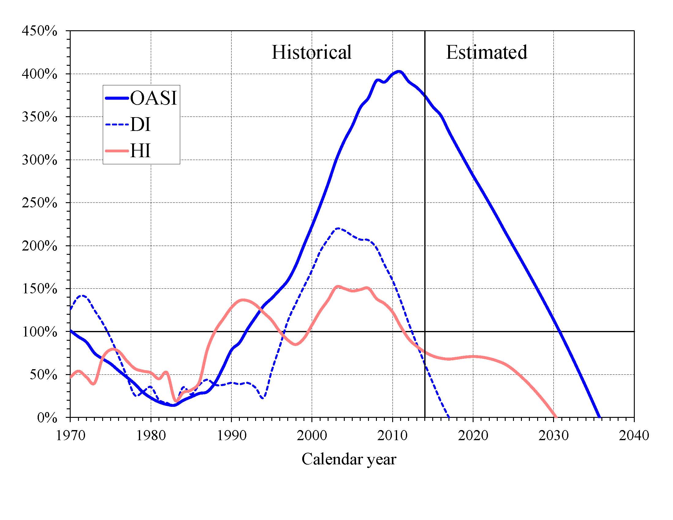 Excess cash reserves. Image source: Social Security and Medicare Board of Trustees 2015 annual report. OASI = Old-Age and Survivors Insurance Trust; DI = Disability Insurance Trust; HI = Hospital Insurance Trust.