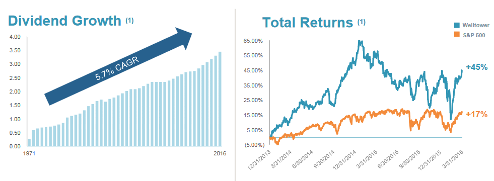 As far as income goes, Welltower pays a 5% dividend yield, and has raised its payout consistently (but not every single year) throughout its 45-year history. Even more impressively, the company has averaged a 15.6% total return during that time -- a remarkable level of performance to sustain for more than four decades. To put this into perspective, a $10,000 investment in Welltower's IPO would be worth more than $6.8 million today.