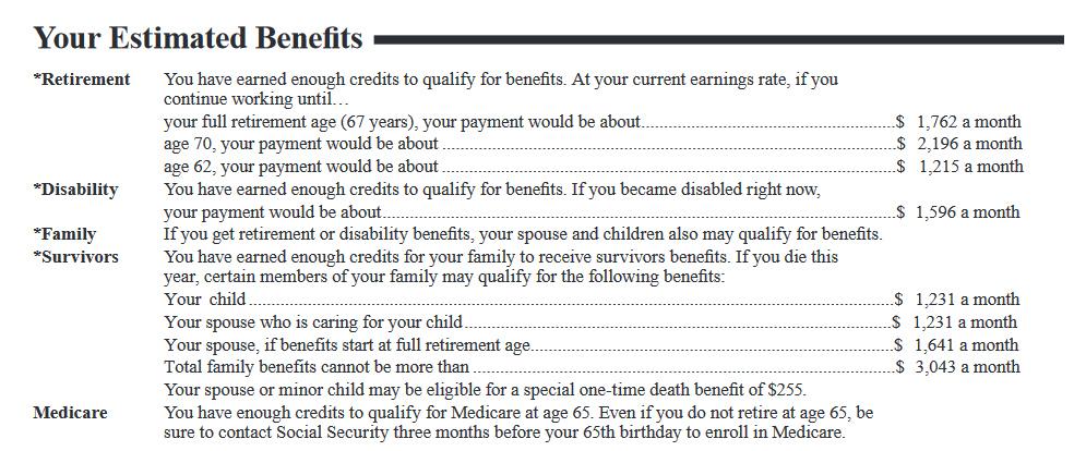 In a nutshell, you'll need to earn 40 credits in order to be eligible for retirement benefits, and may be eligible for other Social Security programs with far less than this amount. The best way to see where you stand and check your eligibility is to create an account on www.ssa.gov, and take a look at your latest Social Security statement. As you can see from the sample statement above, you can find your eligibility status, as well as an estimate of what your benefits could be.